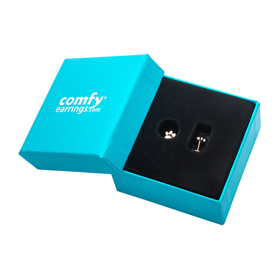 The exclusive screw-on Comfy flat back is just 6.0 mm wide and 2.0 mm thick for maximum comfort and balance. It eliminates pressure on your ears and covers the back of the post to protect your neck from painful pokes (even while sleeping)!