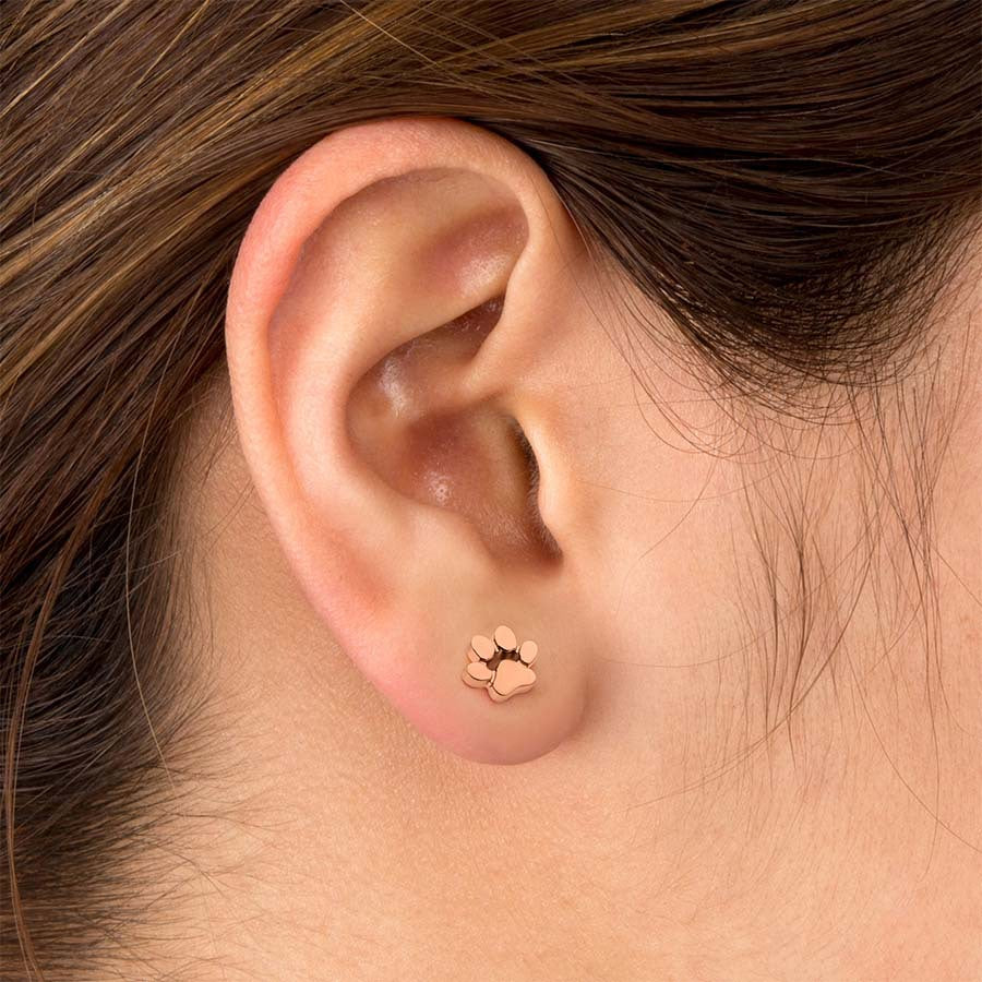 Be comfortable and stylish in ComfyEarrings. Featuring 24K Rose Gold Plated 316L Surgical Grade Stainless Steel paw prints, posts, and backs. Posts are standard width (18 gauge/1.0 mm). Length of post is 6.0 mm long, which is "one size fits most." If you're ordering for small ears, please request free clear spacers in the "order notes."