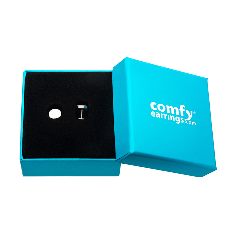 The exclusive screw-on Comfy flat back is just 6.0 mm wide and 2.0 mm thick for maximum comfort and balance. It eliminates pressure on your ears and covers the back of the post to protect your neck from painful pokes (even while sleeping)!