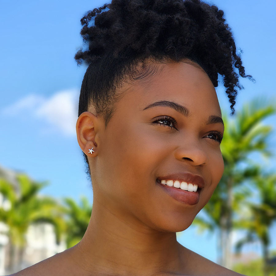 Be comfortable and stylish in ComfyEarrings. Featuring 316L Surgical Grade Stainless Steel starfish shapes, posts, and backs. Posts are standard width (18 gauge/1.0 mm). Length of post is 6.0 mm long, which is "one size fits most." If you're ordering for small ears, please request free clear spacers in the "order notes."